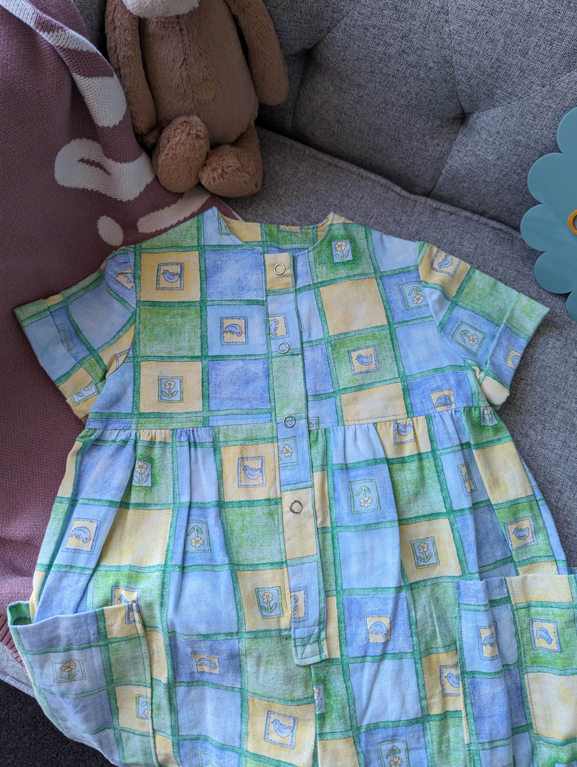 Made from an amazing vintage, 90s fabric and pattern these coveralls are fantastic and roomy, and have two nice, big pockets for all of those toddler treasures
